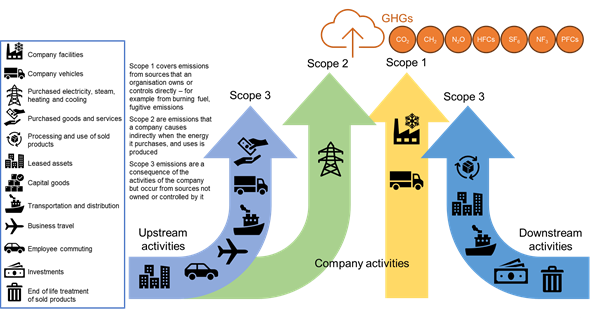 Scope emissions are a way of categorising greenhouse gas (GHG) emissions based on where they originate within a company's value chain. The three main scopes are: scope 1 (direct emissions), scope 2 (indirect emissions from purchased energy), and scope 3 (other indirect emissions across the value chain).