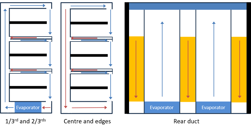 A cabinet was adapted to incorporate short air curtain technology. This involved shelves which incorporated vaned ducting to allow cold air to exit the shelves, forming sequential air curtains, and air to be returned to the evaporator to be re-cooled. To do this required the cabinet to be split into different sections along its length such that air could be delivered to the air curtains and returned to the evaporator.